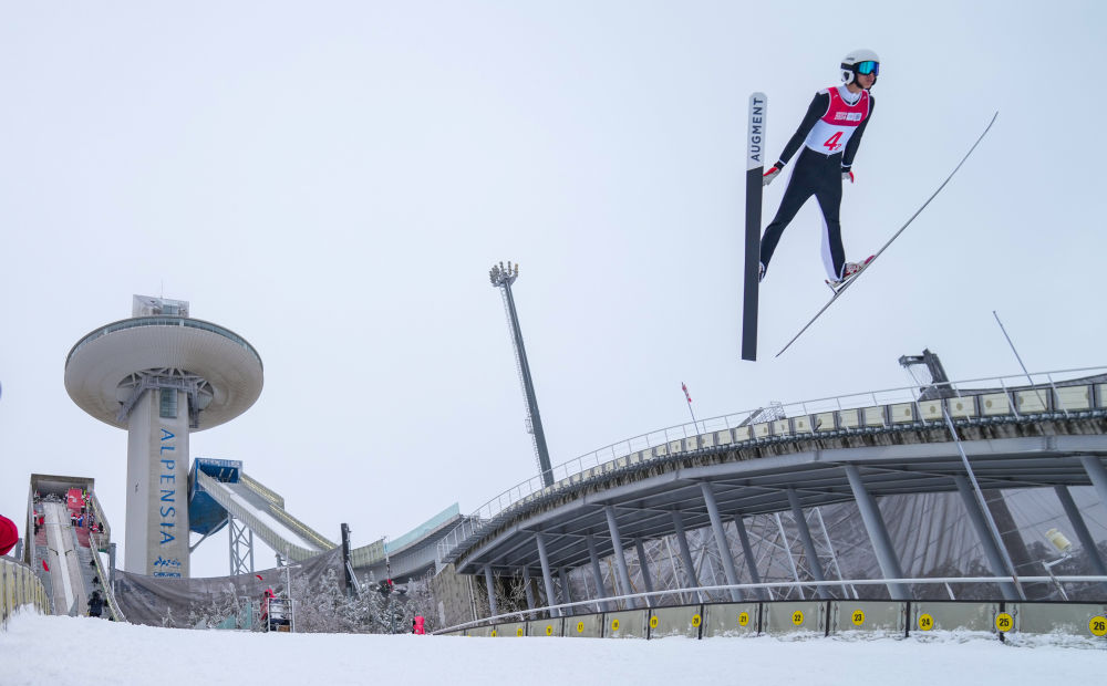 1月21日,跳台滑雪混合团体赛决赛中,中国组合任浩然、郑鹏博、翁杨宁和唐嘉鸿以543.2分的成绩获得第十二名,图为任浩然在比赛中。新华社记者 张笑宇 摄