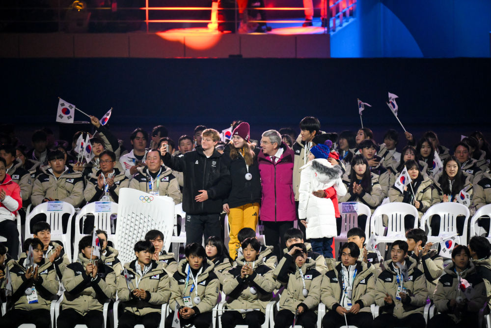 1月19日,国际奥委会主席巴赫在江陵速滑馆开幕式现场与运动员合影。当日,第四届冬季青年奥林匹克运动会开幕式在韩国江原道江陵速滑馆和平昌圆顶体育馆同时举行。新华社记者 朱炜 摄