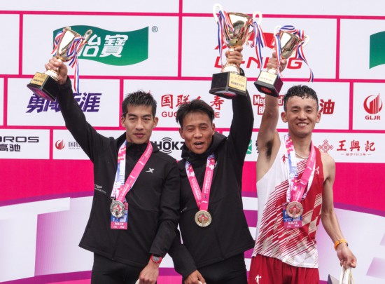 3月24日,冠军何杰(中)、亚军杨绍辉(左)和季军桑吉东知在全国马拉松锦标赛(第一站)男子组颁奖仪式上。新华社记者 杨磊 摄
