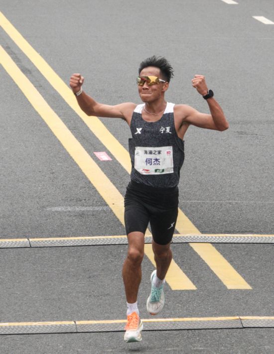 3月24日,何杰在比赛中冲线。最终,他以2小时06分57秒的成绩获得全国马拉松锦标赛(第一站)男子组冠军并创造了新的全国纪录。新华社记者 杨磊 摄