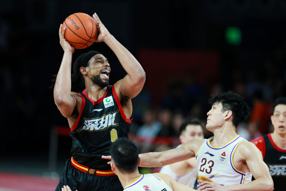 4月15日,深圳队球员萨林杰(左)在比赛中伺机进攻。新华社发(彭志刚摄)