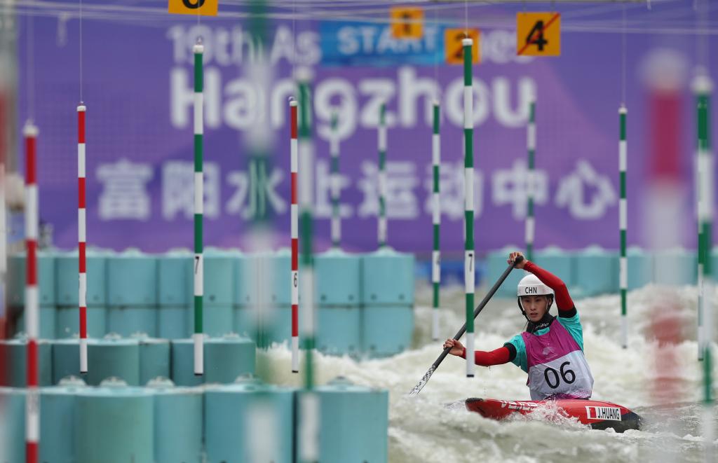 2023年10月7日,杭州亚运会皮划艇激流回旋项目女子单人划艇决赛在杭州富阳水上运动中心举行,图为中国选手黄娟在比赛中获得冠军。新华社记者 杜潇逸 摄