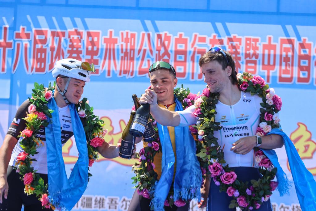 5月30日,第十六届环赛里木湖赛第三赛段比赛结束后,尼古拉斯·马利尼(右1)与其他获奖选手庆祝胜利。新华社发(于苏甫·艾尼 摄)