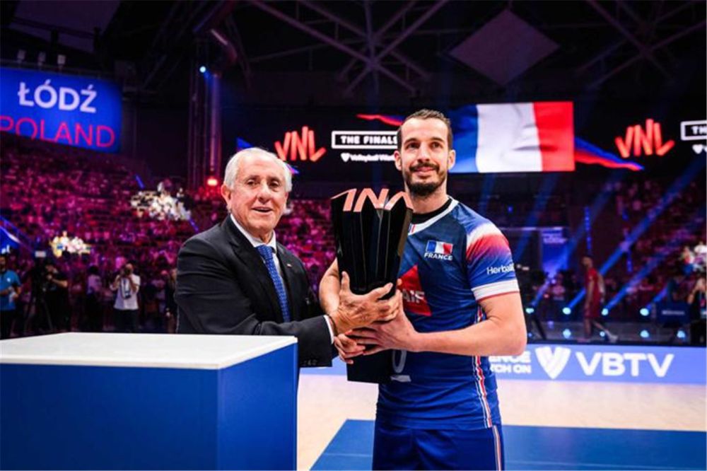 法国排球国家队队长本杰明·托纽蒂上台领取奖杯,图片来自FIVB国际排联官网。