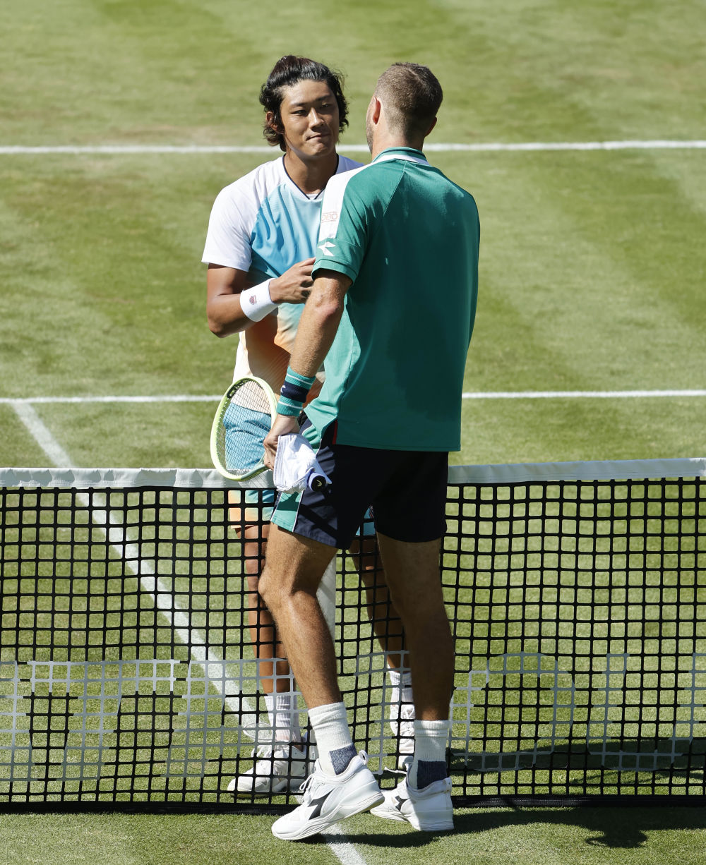 2023年6月13日,张之臻(左)在比赛后与斯特鲁夫致意。当日,在德国斯图加特网球公开赛男子单打首轮比赛中,中国选手张之臻以0比2不敌德国选手斯特鲁夫,无缘第二轮。新华社发(菲利普·鲁伊兹 摄)