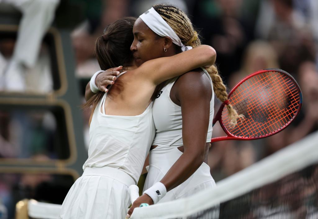 7月7日,高芙(右)与纳瓦罗在比赛后拥抱致意。新华社记者 韩岩 摄