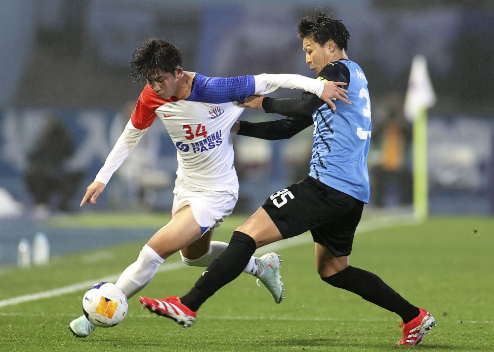 3月12日,上海申花队球员刘诚宇(左)与川崎前锋队球员丸山祐市在比赛中拼抢。新华社记者 贾浩成 摄