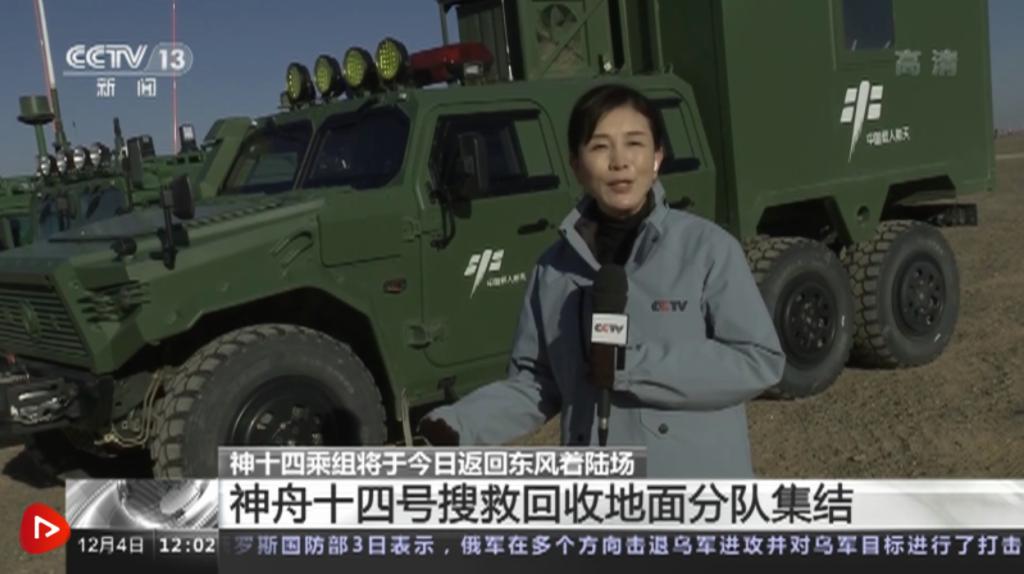 总台央视记者 刘洁:随着神舟十四号返回时间的临近,东风着陆场的搜救力量也做好了充分的准备。我们看到地面分队配备了很多车辆,比如说这辆小型搜索车,队员们都亲切地叫它“小搜”,搜救过程中,它会跑在整个队伍的最前面,作为“急先锋”的作用对返回舱进行搜索。它与传统的猛士车辆不同的是,它后面加装了一个后车厢,可以乘坐6名队员,加上前座的4名队员,这10名队员就有足够的能力对返回舱进行第一阶段的处理工作。