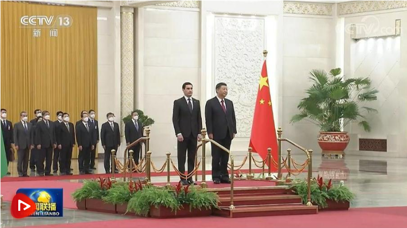 谢尔达尔·别尔德穆哈梅多夫在习近平陪同下检阅中国人民解放军仪仗队。