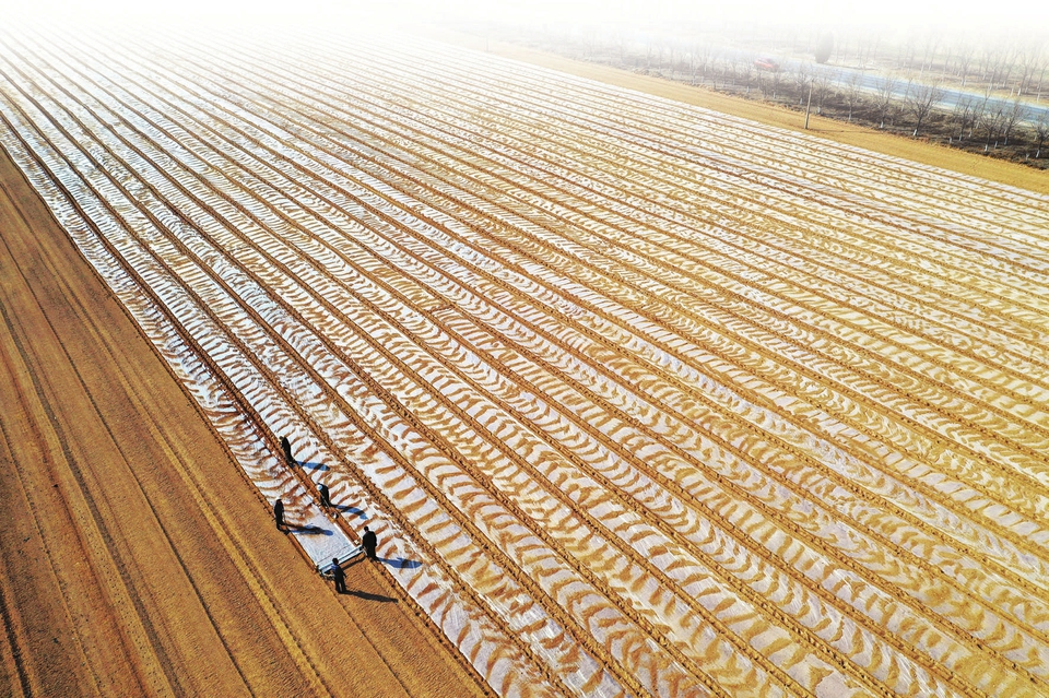 3月24日,在运城市北部峨嵋岭上闻喜县畖底镇西畖底村,村民抓紧为中药材防风覆盖地膜保墒保苗(无人机照片)。连日来,运城市农民抢抓农时科学种植中药材,为新种植的防风等中药材精心覆盖地膜,节能保墒保苗保质量,助力增产增收。从空中俯瞰,田间覆盖的地膜与农民劳作的身影相映成趣,宛如一幅精美的现代农耕画卷。高新生摄