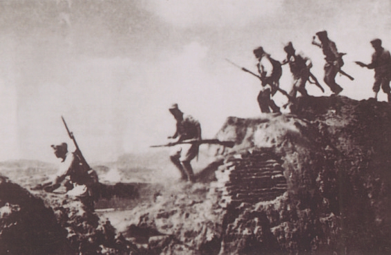 图12 1938年春,晋西北抗日根据地军民打退日军的五路围攻,收复宁武、神池等7座县城。图为部队在收复宁武县城战斗中。