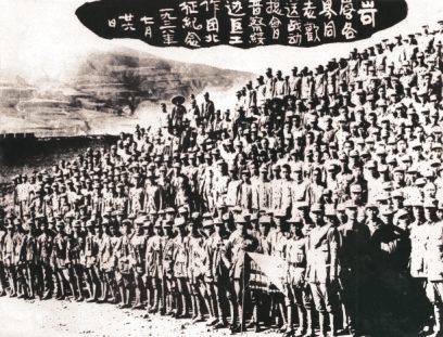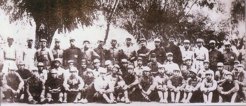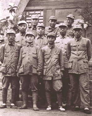 图10 1938年1月,八路军第一一五师主力开辟晋西南抗日根据地。图为罗荣桓(二排左三)、杨尚昆(二排左二)等在孝义。