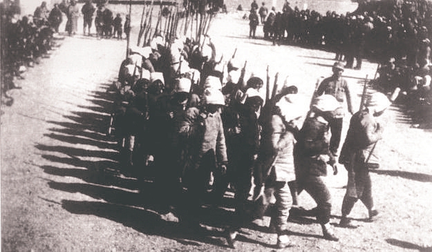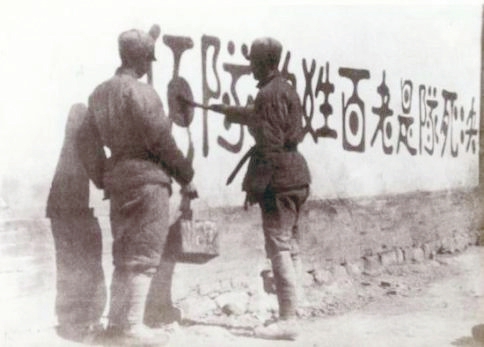 图2 山西新军既是战斗队,又是工作队。他们走到哪里,宣传到哪里,动员青年参军;组织人民武装自卫队、游击队;协助地方建党、建政,组建工、农、青、妇等群众团体,创建抗日根据地。图为1938年初,决死队战士在沁县书写宣传标语。