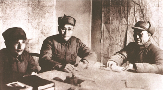 图9 1937年12月,八路军第一二九师开辟以太行山为中心的晋冀豫抗日根据地。图为朱德(右)与刘伯承(中)、邓小平(左)在研究根据地建设。