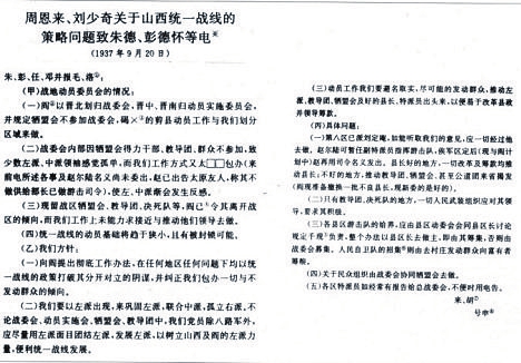 图1 1937年9月20日,周恩来、刘少奇关于山西统一战线的策略问题致朱德、彭德怀等电。