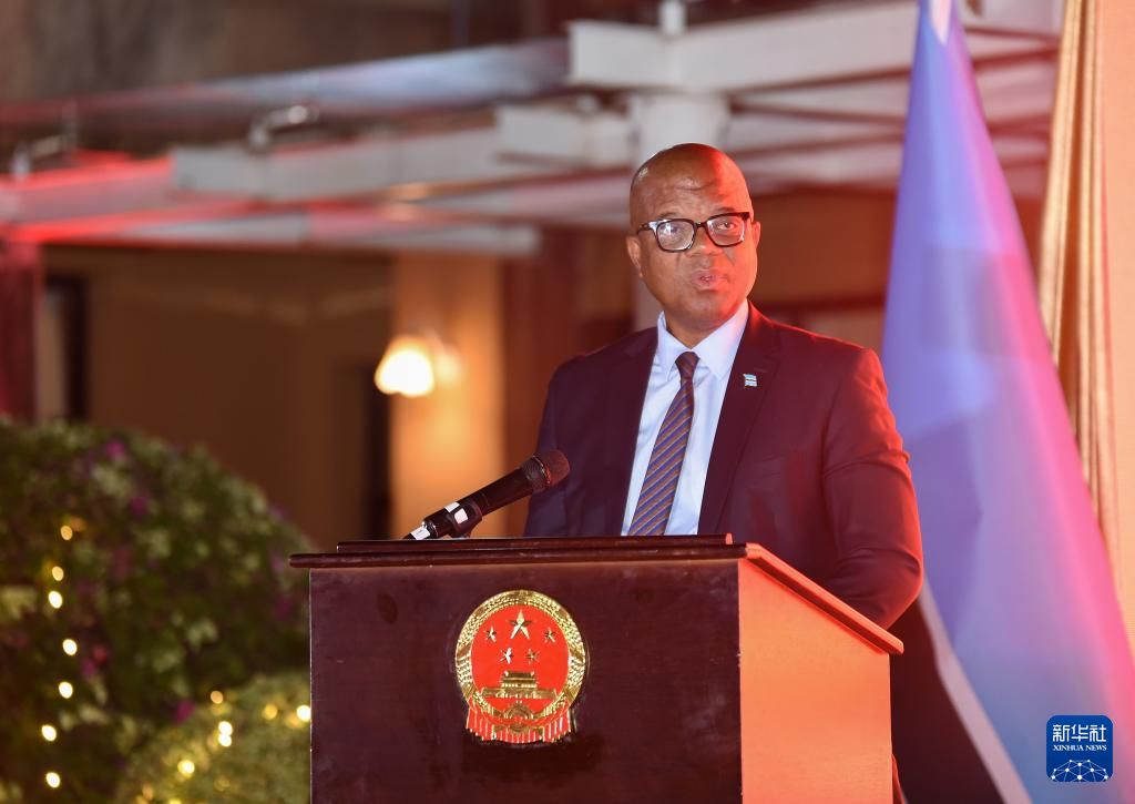 9月25日,在博茨瓦纳首都哈博罗内,博茨瓦纳总统事务部长莫瓦萨在庆祝中华人民共和国成立76周年招待会上讲话。新华社发(策基索·特巴洛摄)