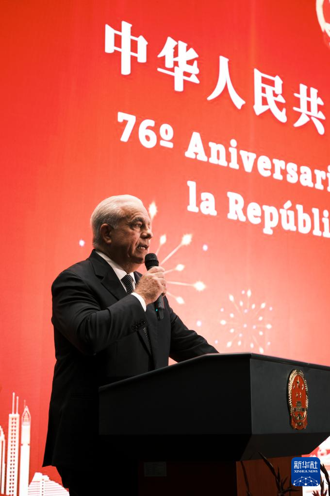 9月22日,在巴拿马首都巴拿马城,巴拿马农业发展部长利纳雷斯在庆祝中华人民共和国成立76周年招待会上讲话。新华社记者 许咏政 摄