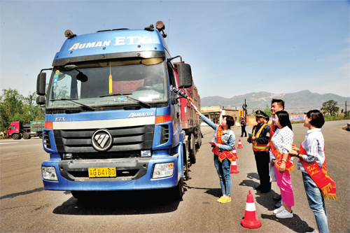 5月13日上午,代县公路管理段组织路政执法人员和共青团员,深入到阳明堡镇治超点和四岔路口开展以“依法治路保障畅通,爱护桥梁保障安全”为主题的路政宣传月活动。(石俊文 摄)