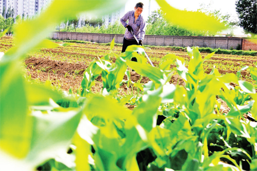 5 月17 日,原平市新原乡农民拿起锄头,正忙着进行田间管理。农历小满将至,气温升高,降雨量逐渐增多,大田农作物生长加快,原平农民在田间地头又忙活开了,浇水灌溉,松土间苗,为今年粮食的丰收打下坚实基础。(吉建平 摄)