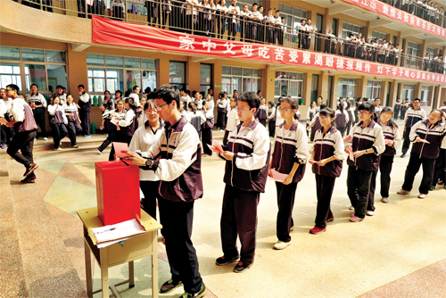 5 月19 日上午,忻州市第一中学师生利用课间操活动时间,参加忻府区换届选举教育选区选举区人大代表的投票活动。图为学生们将填写好的选票投入投票箱。(鲁明强 摄)