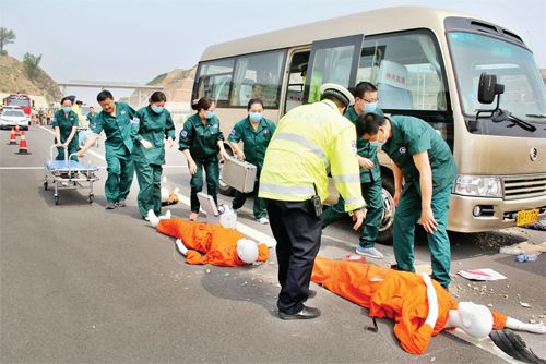 6 月1 日,为了提高对突发事件的应急处置能力,灵河高速公路神河段建设管理处联合偏关县应急办、公安消防大队等有关部门单位成功举行了群死群伤重特大交通事故应急处置演练。图为演练现场。(孟建国 摄)