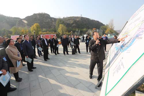 11月2日, 芮城县委书记董旭光在圣天湖景区, 向采风团介绍该县全域旅游情况。记者 王阳斌 摄