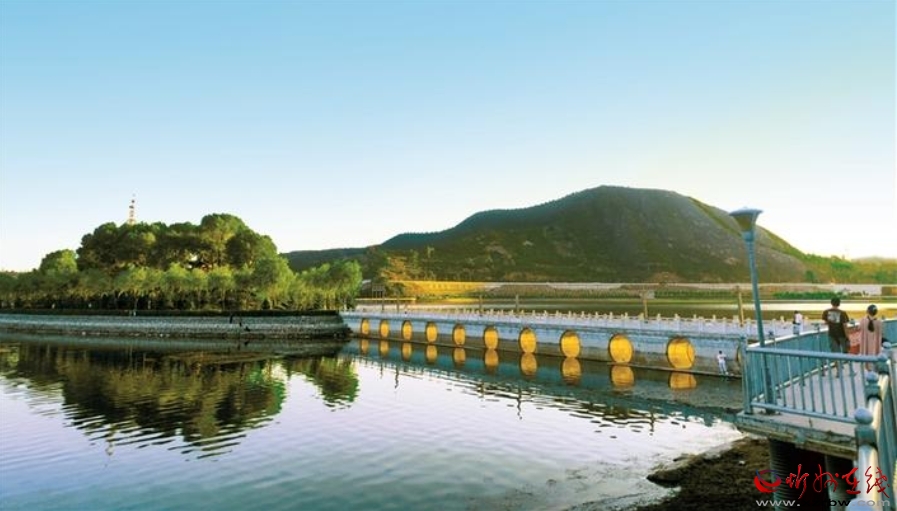 傍晚的五台县瀛湖公园,落日余晖穿过石桥洞,呈现出“金光穿洞”美景。 (