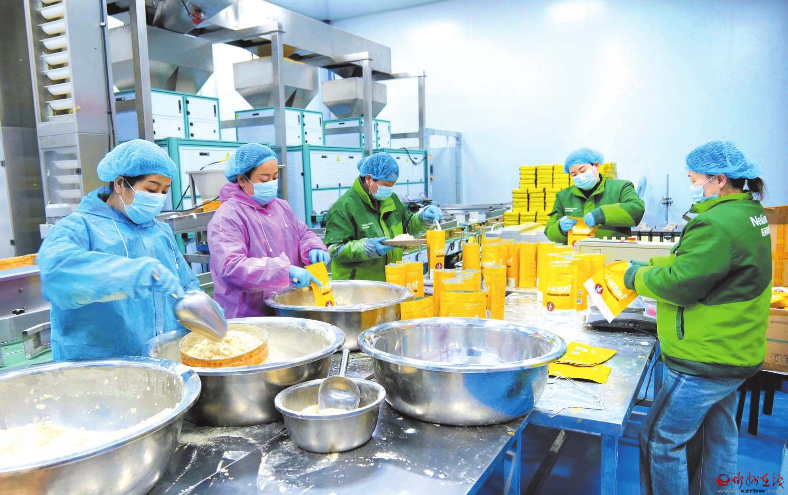 在山西莲芯硒美农业科技开发有限公司的生产车间内,工人们正在紧张有序地将小米面和富硒小米装袋、封包、运送。他们在各自岗位上辛勤忙碌,铆足干劲加力生产。
