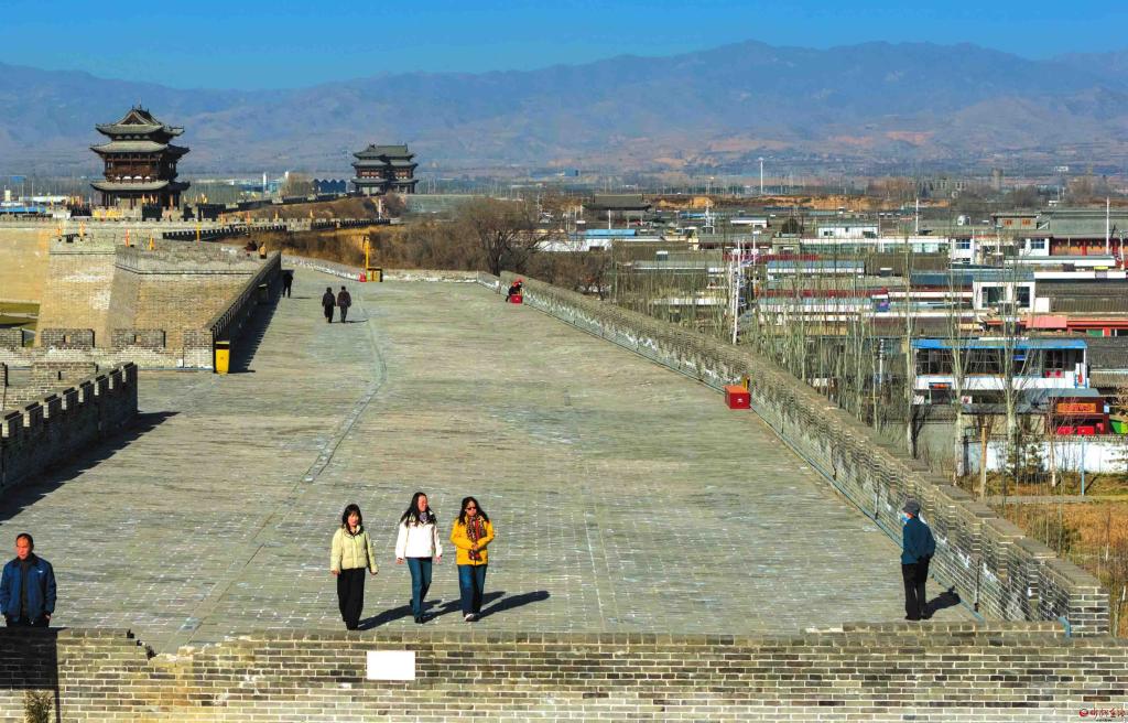 代州古城西城墙历经多年保护性修缮,是古城目前唯一修复完整并对外开放的城墙段落。图为12月1日,游人登上西城墙游览观光。(