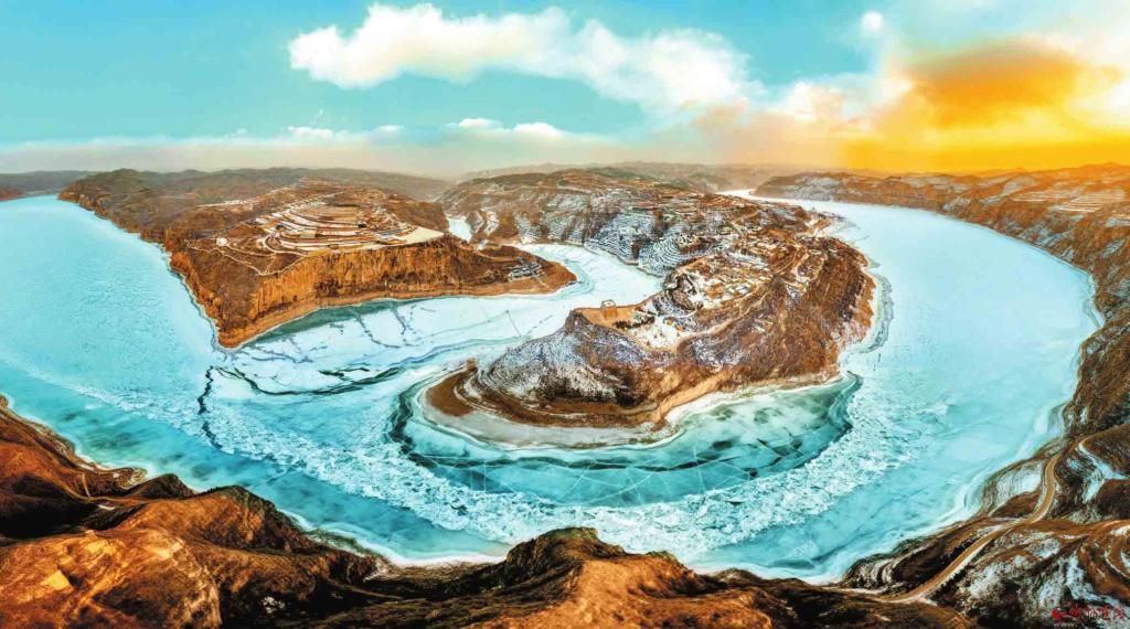 隆冬时节,偏关老牛湾被冰雪覆盖,清晨的霞光让黄土沟壑与冰面纹理交织出别样风景。(