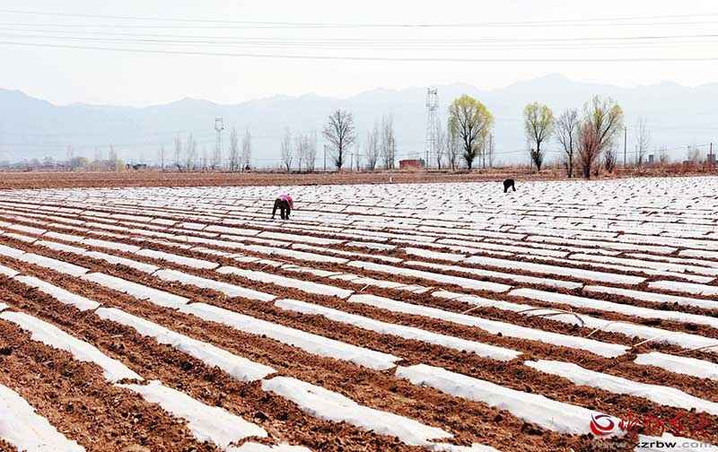 4月9日,定襄县留念村村民抢抓农时,栽种西瓜苗、搭建瓜架,田间一派繁忙的春耕景象。(