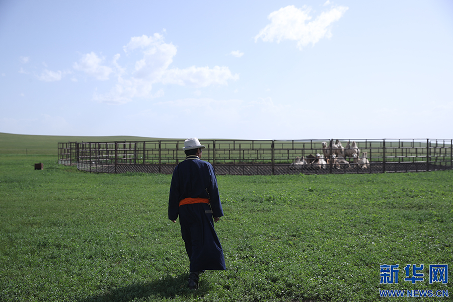 8月2日,其日麦拉图在自家草场查看骆驼的喂养情况。新华网记者 焦鹏摄