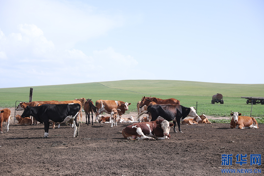 8月2日,其日麦拉图家的几头牛在草场上吃草。新华网记者 焦鹏摄