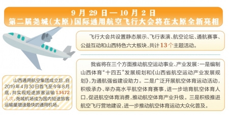 为加大我省通航产业招商引资力度,促进山西通航短途运输、低空旅游、应急救援、飞行培训等业务飞速发展,加快航空科技、航空制造、高新技术研发等创新企业落地山西,推动全产业链通用航空业加快发展,在成功举办第一届的基础上,9月29日—10月2日,第二届尧城(太原)国际通用航空飞行大会将在太原全新亮相。