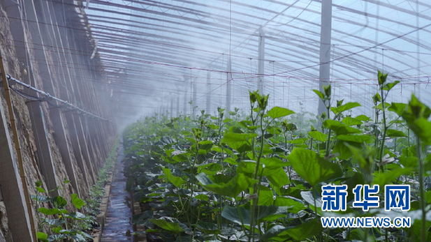 蔬菜大棚内,正在进行雾化浇水。新华网发 (尹杰 摄)