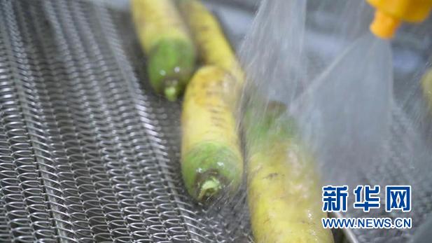 净菜加工间内,自动化流水线上,正在清洗胡萝卜。新华网发 (尹杰 摄)