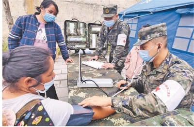 9月7日,武警第二机动总队某支队官兵为泸定县地震灾区群众巡诊。李天标摄(新华社发)