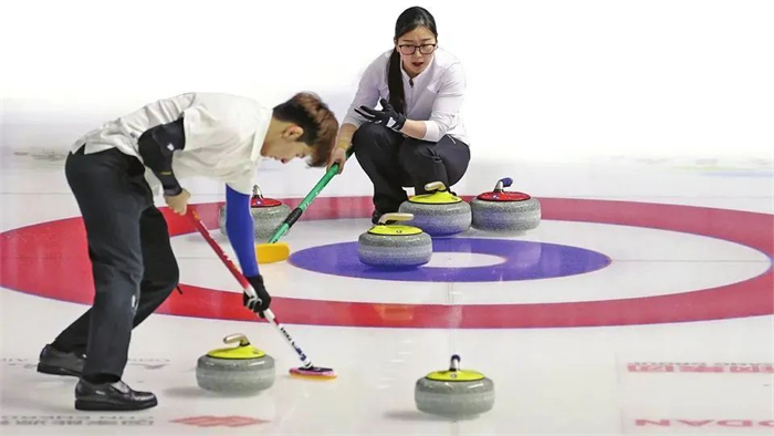 ▲1月12日,山西省与黑龙江省联合培养的运动员李思霖、文馨悦,在冰壶(青年组)混双决赛中夺得金牌。这是本届冬运会山西代表团获得的首枚金牌。新华社/图