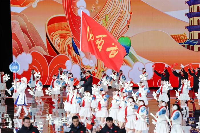 ▲2月17日晚,第十四届全国冬季运动会开幕式上,山西体育代表团入场。宇巍/图