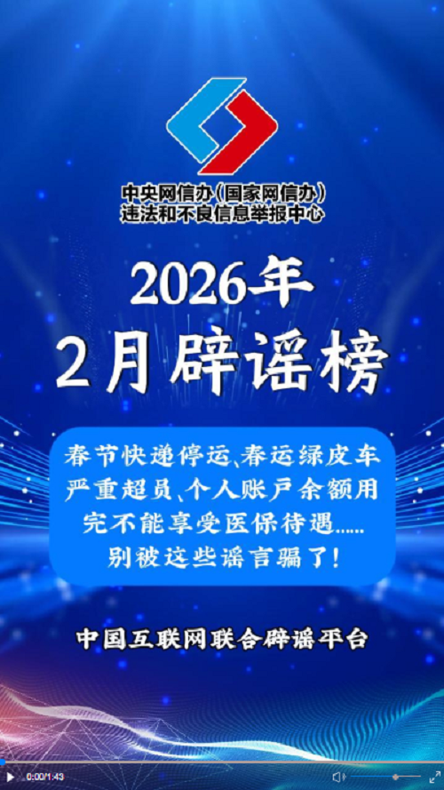 编造民生保障类谣言扰乱民心。网传“2026年春运绿皮车严重超员”视频,相关内容系拼凑历史画面,利用AI生成;“春节快递停运”系谣言,多家快递企业春节正常营运,保障居民寄递需求;“通过小程序可领500元分娩补贴”并非官方正规补贴政策,而是不法分子设置的虚假引流骗局;“个人账户余额用完,不能享受医保待遇”则是对医保统筹保障政策的错误解读,网民切勿因误信谣言而延误正常就医报销。