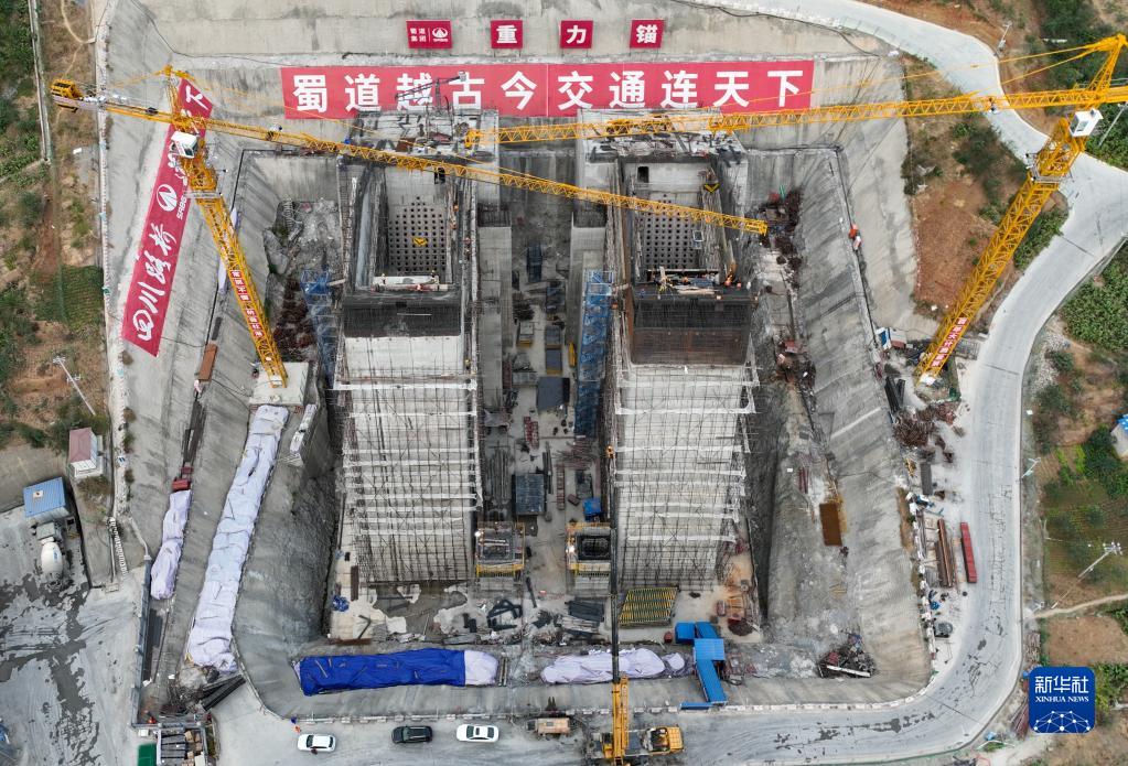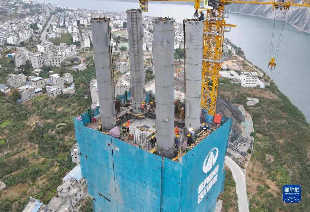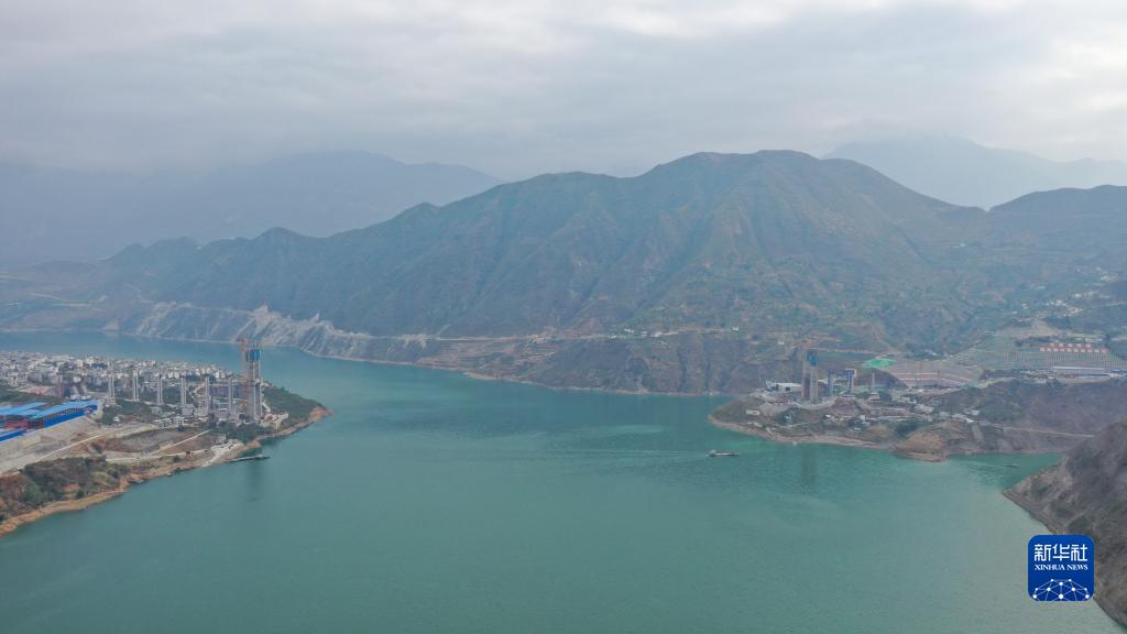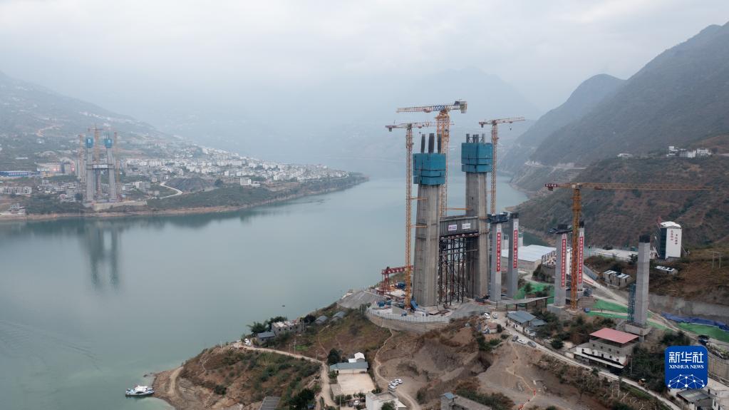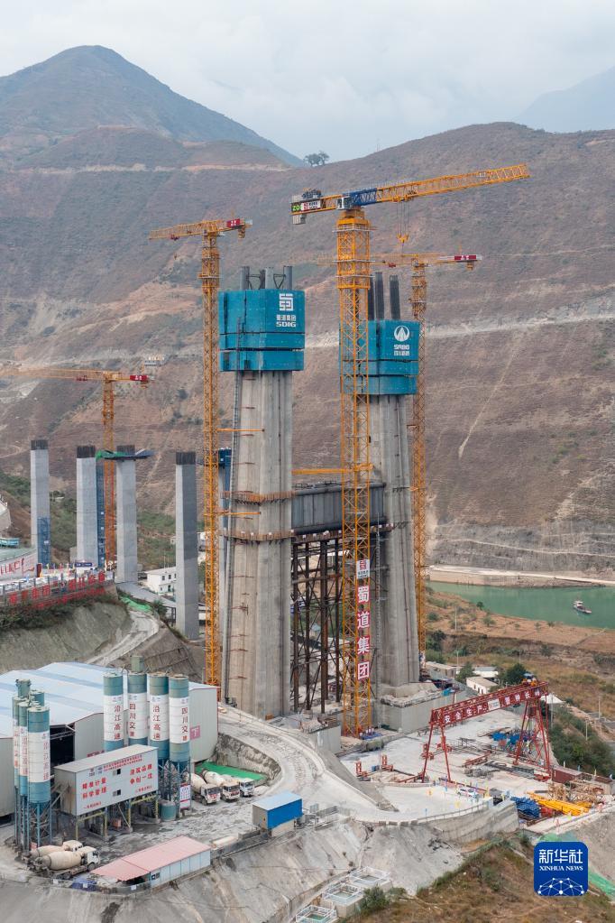 这是11月23日拍摄的卡哈洛金沙江大桥施工现场(无人机照片)。(新华社记者 胥冰洁 摄)