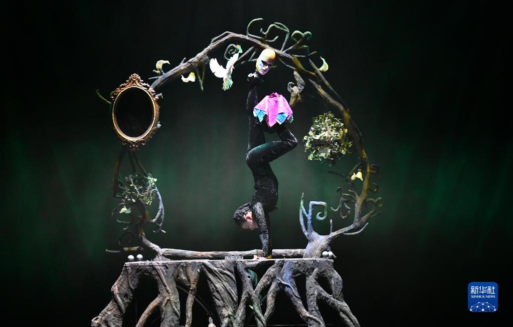 3月27日晚,在位于山东省济南市的山东剧院,演员表演杂技节目《无形·倒立技巧》。(新华社记者 徐速绘 摄)