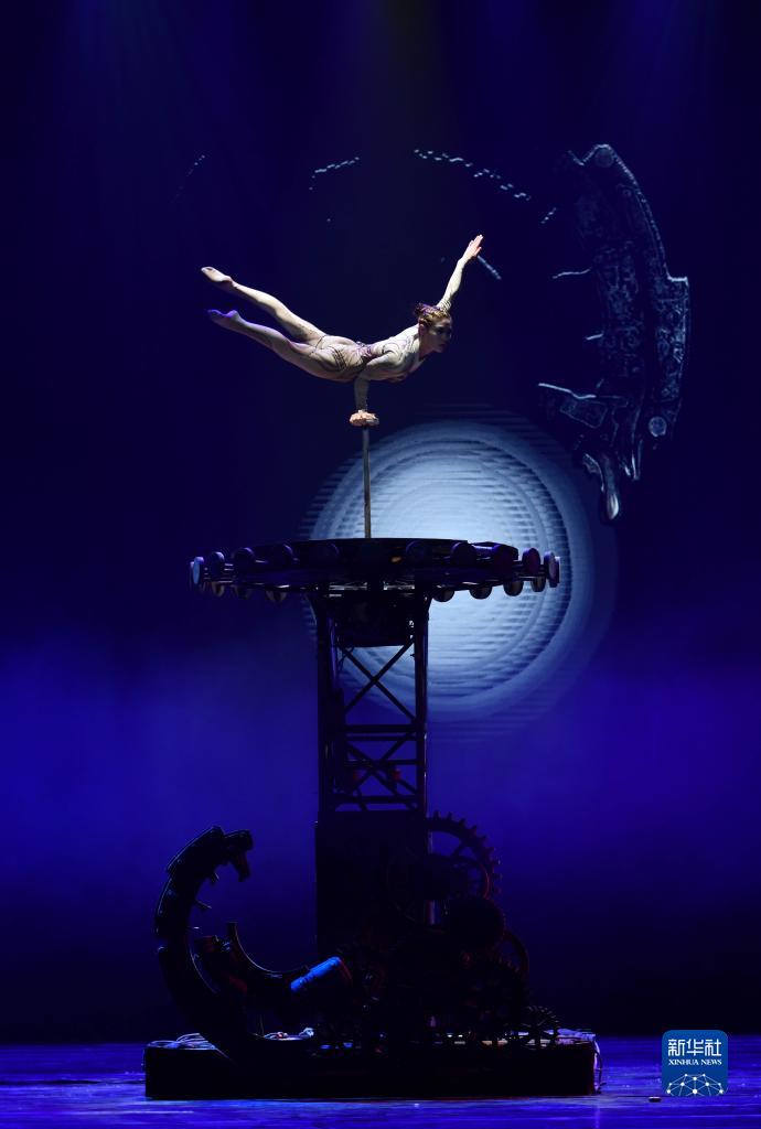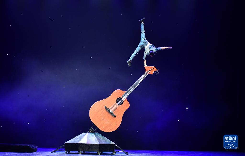 3月27日晚,在位于山东省济南市的山东剧院,演员表演杂技节目《弦》。(新华社记者 徐速绘 摄)
