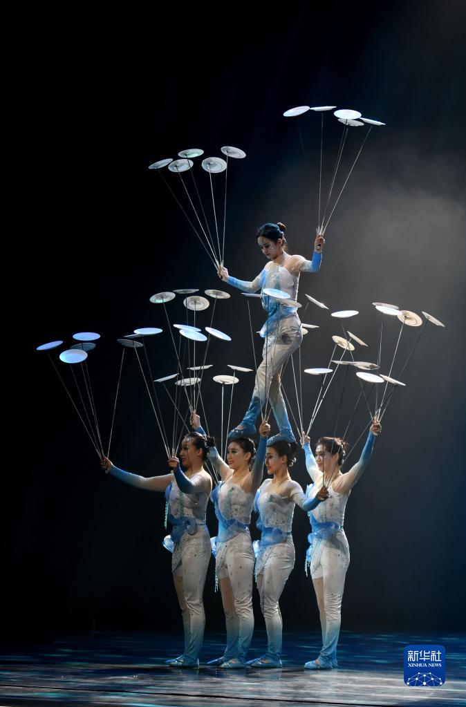 3月27日晚,在位于山东省济南市的山东剧院,演员表演杂技节目《集体花盘》。(新华社记者 徐速绘 摄)