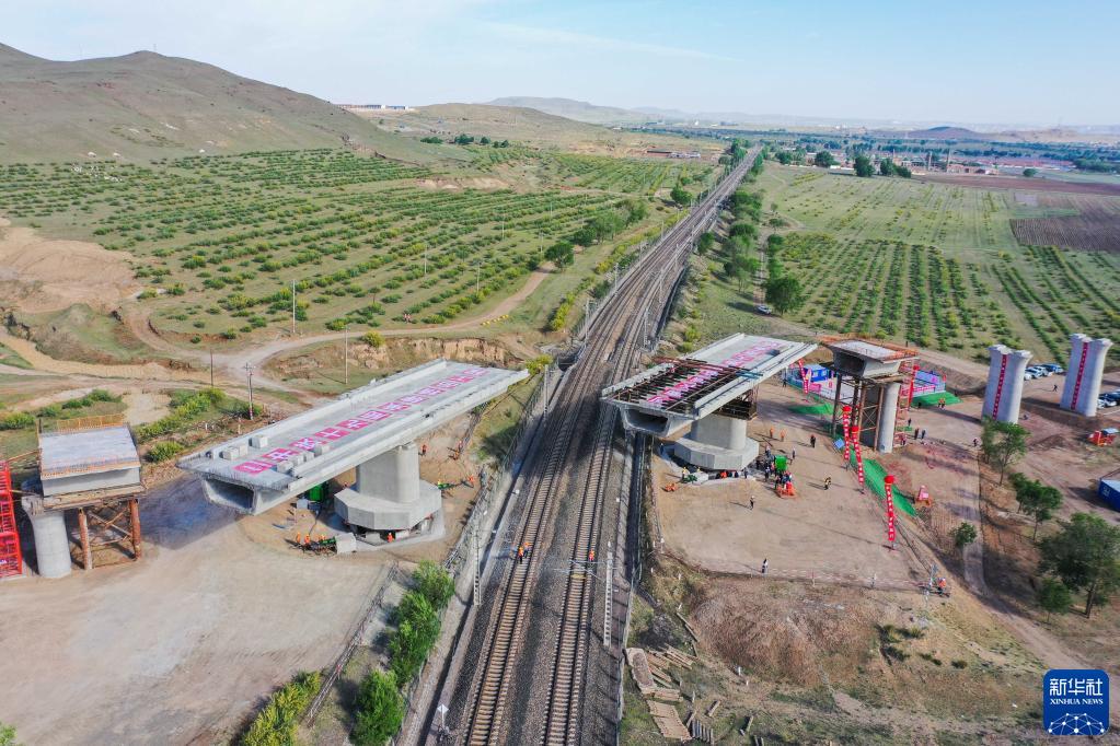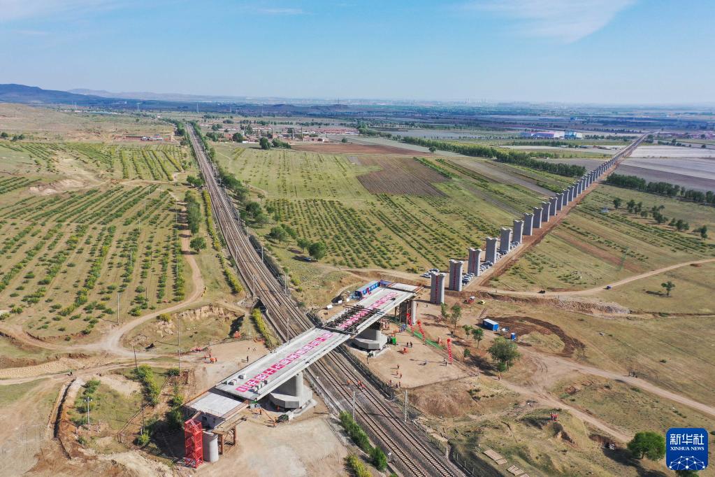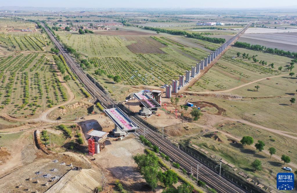 5月29日,集大原高铁跨京包铁路连续梁转体完成(无人机照片)。(新华社记者 刘磊 摄)
