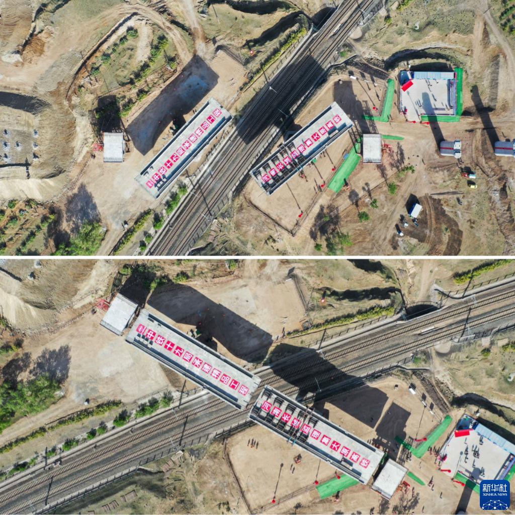 拼版照片:上图为5月29日,集大原高铁跨京包铁路连续梁转体中;下图为5月29日,集大原高铁跨京包铁路连续梁转体完成。(新华社记者 刘磊 摄)