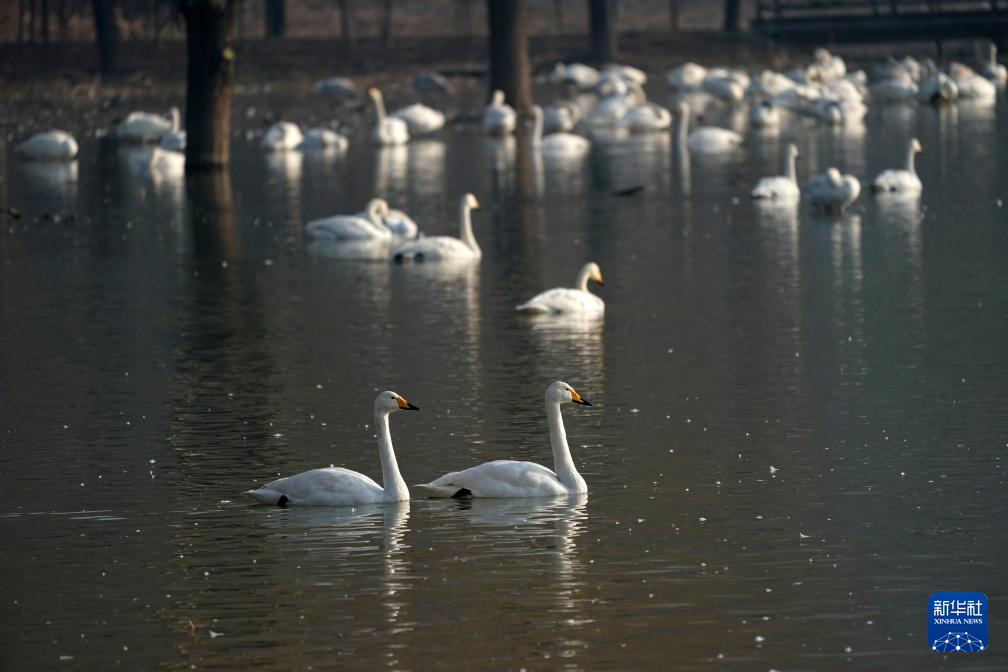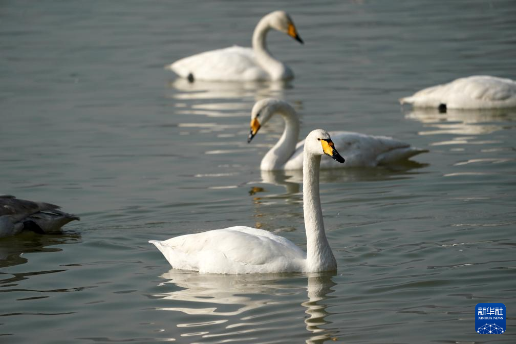 1月9日,白天鹅在山西平陆黄河湿地栖息。(新华社记者 詹彦 摄)