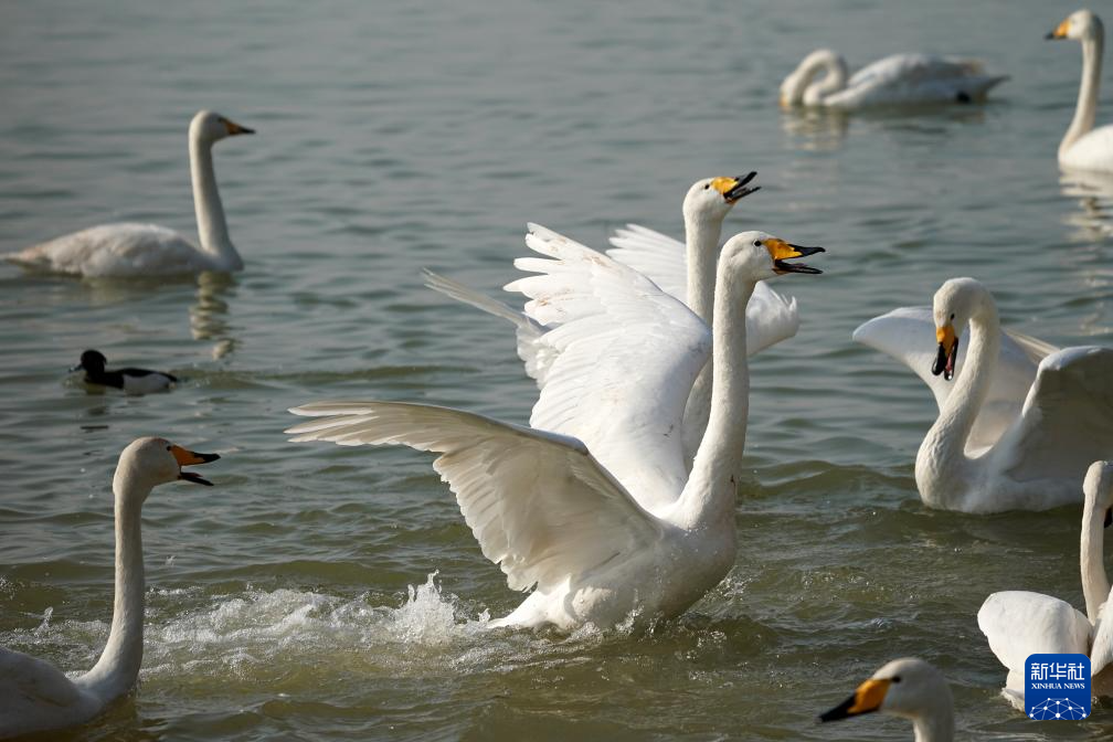 1月9日,白天鹅在山西平陆黄河湿地嬉戏。(新华社记者 詹彦 摄)