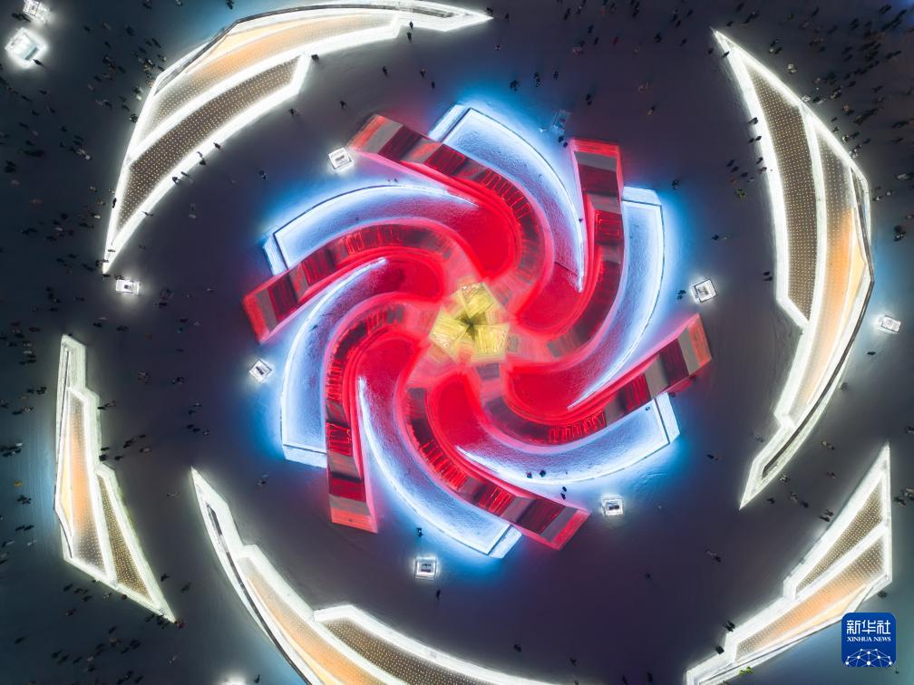 游客在哈尔滨冰雪大世界园区内游玩(无人机照片,1月9日摄)。(新华社记者 张涛 摄)