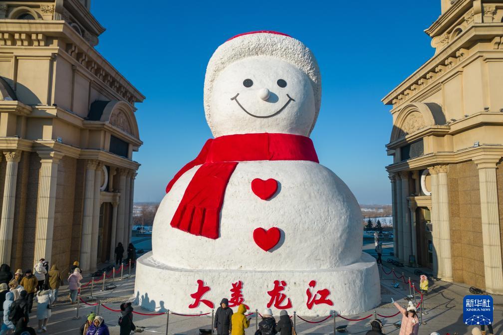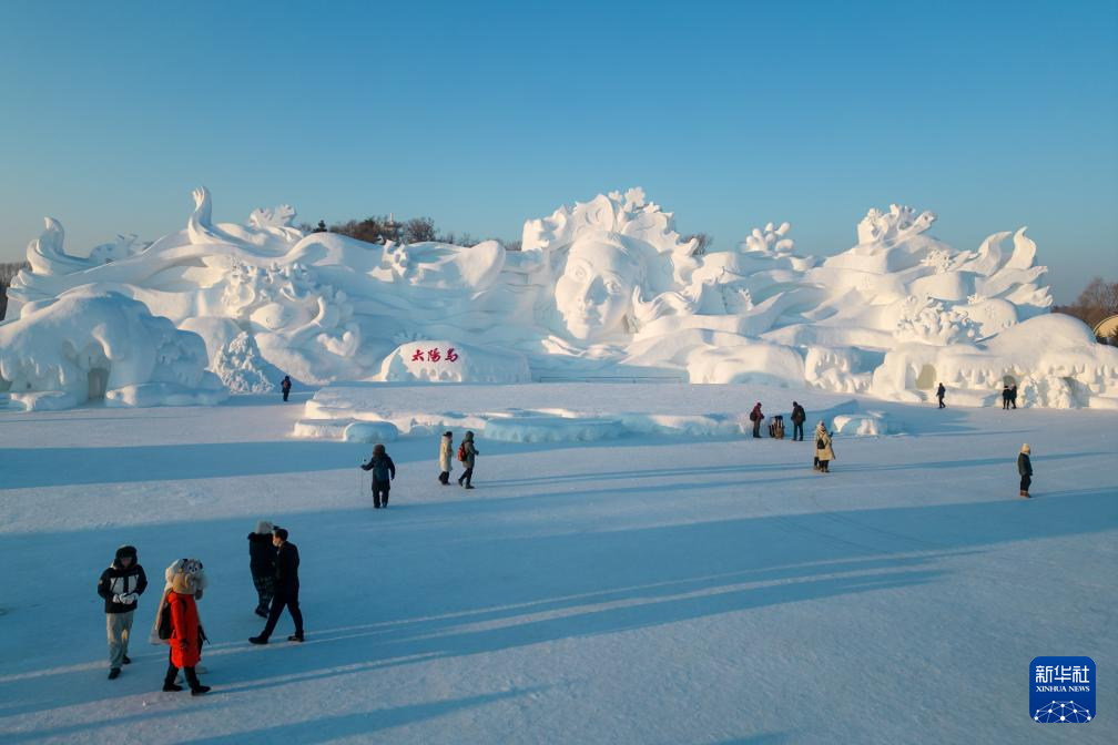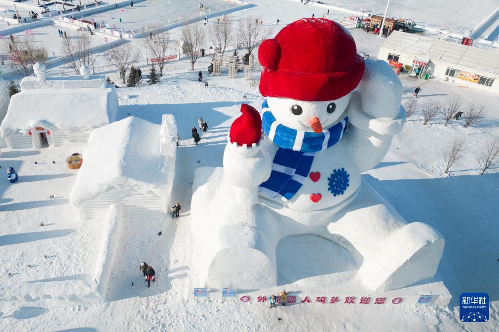在哈尔滨群力音乐公园,游客参观“网红”大雪人(无人机照片,1月9日摄)。(新华社记者 张涛 摄)